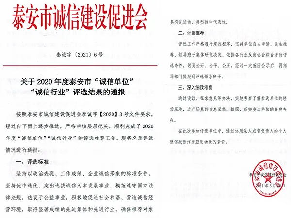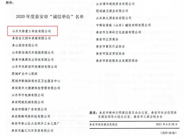 经过严格审核,浙江增洲重工科技有限公司等二十几家企业被评为2020年度泰安市首届“诚信单位”。